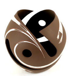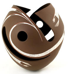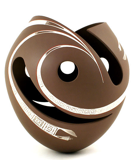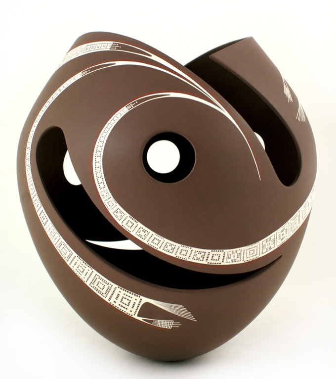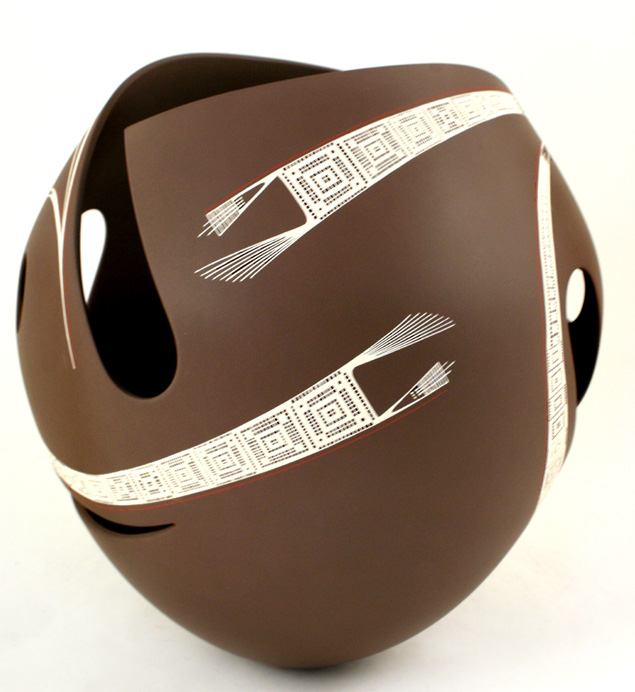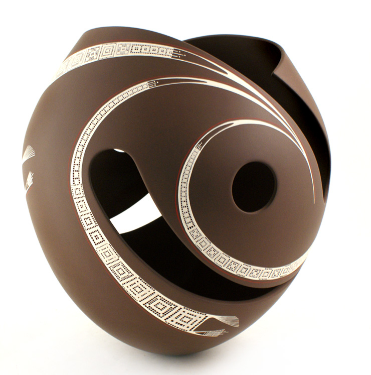 traditional elements such as the shape of an olla and classic lacelike Mata Ortiz painting, he is creating new forms full of expressiveness and
